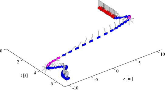 For the proposed algorithm (?), we tested the performance for a non-linear, non-stationary cart-pole task. For t=0-2 s the peak of the reward function was z=10 m, then the peak moves to z=-10m. Fig. 1 shows the trajectory of the cart-pole. The color of the cart represents a particular (?) reward model. Next, we try for the acrobot swingup task, which has a strong non-linearity. Fig. 2. shows the results. Despite the strong non-inearity, the agent could succesfully learn to swing up.